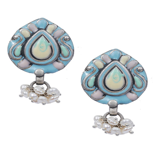 Pastel Blue Handcrafted Enamel Earrings With Pearl Hangings - UMANG