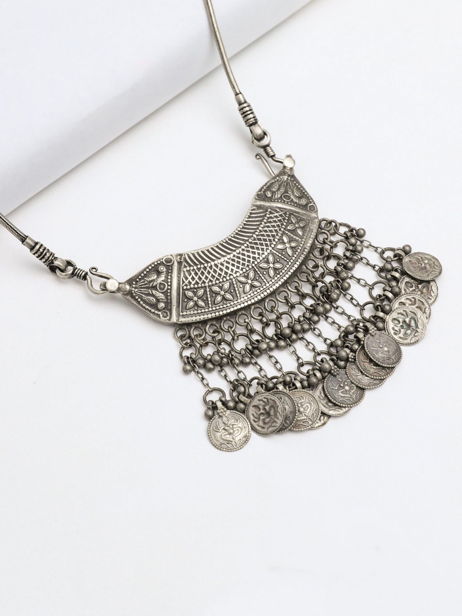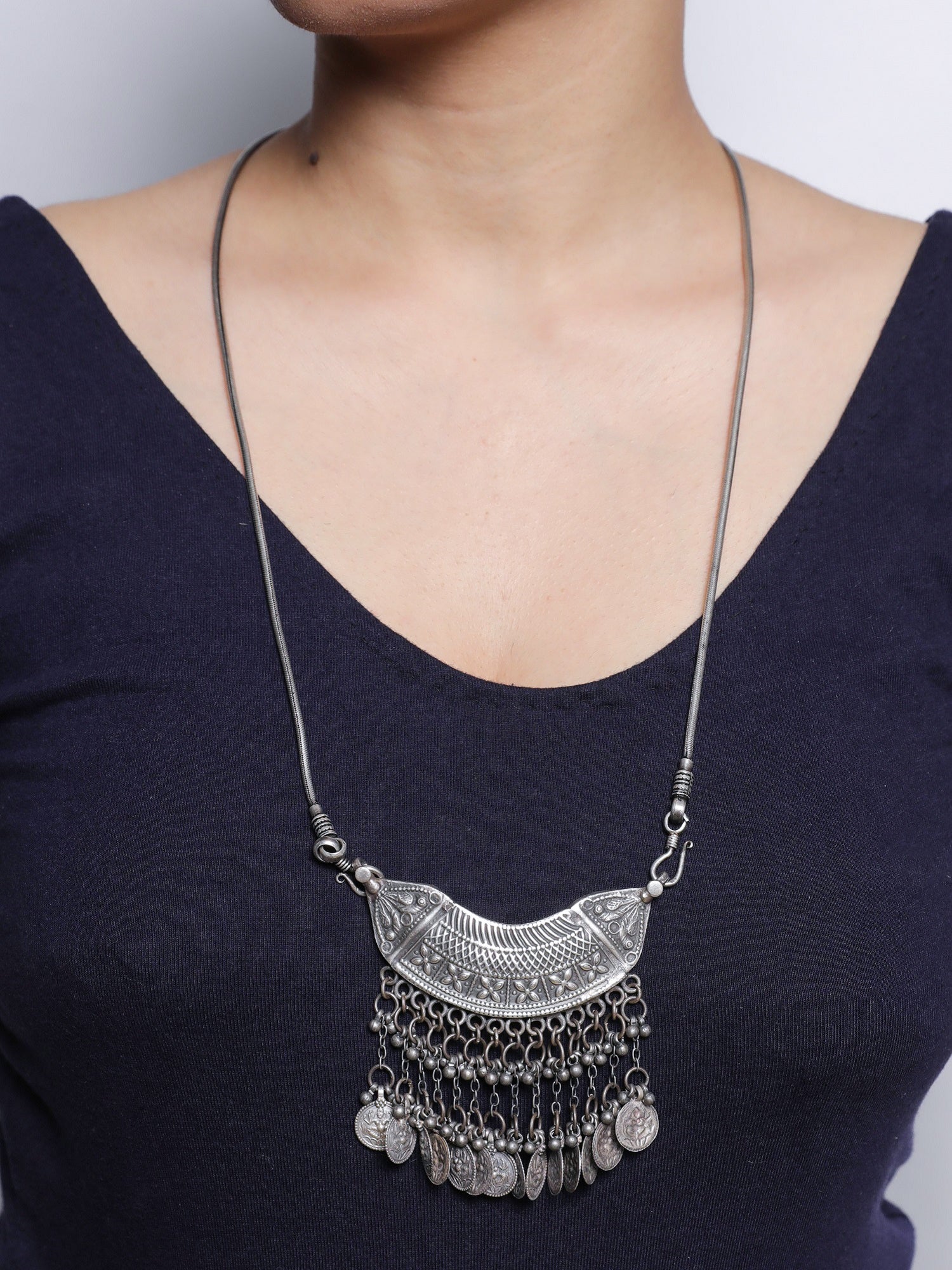 Moon shape pendant with Flower embossing long necklace embellished with Ghungroo hangings. The snake chain of the necklace can be detached and used with a different pendant.