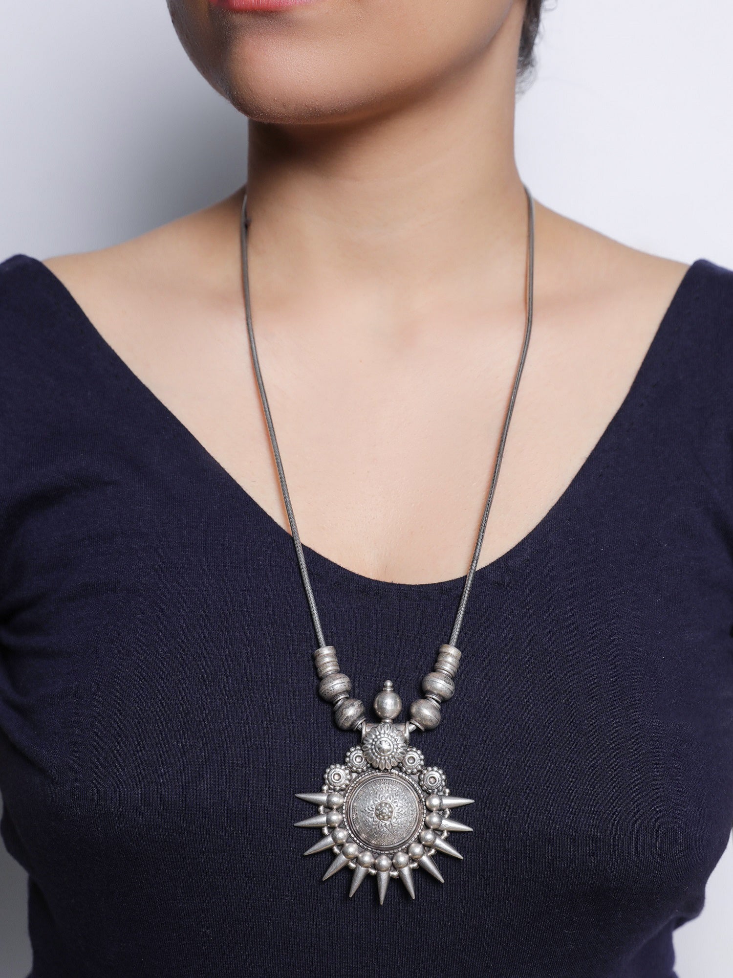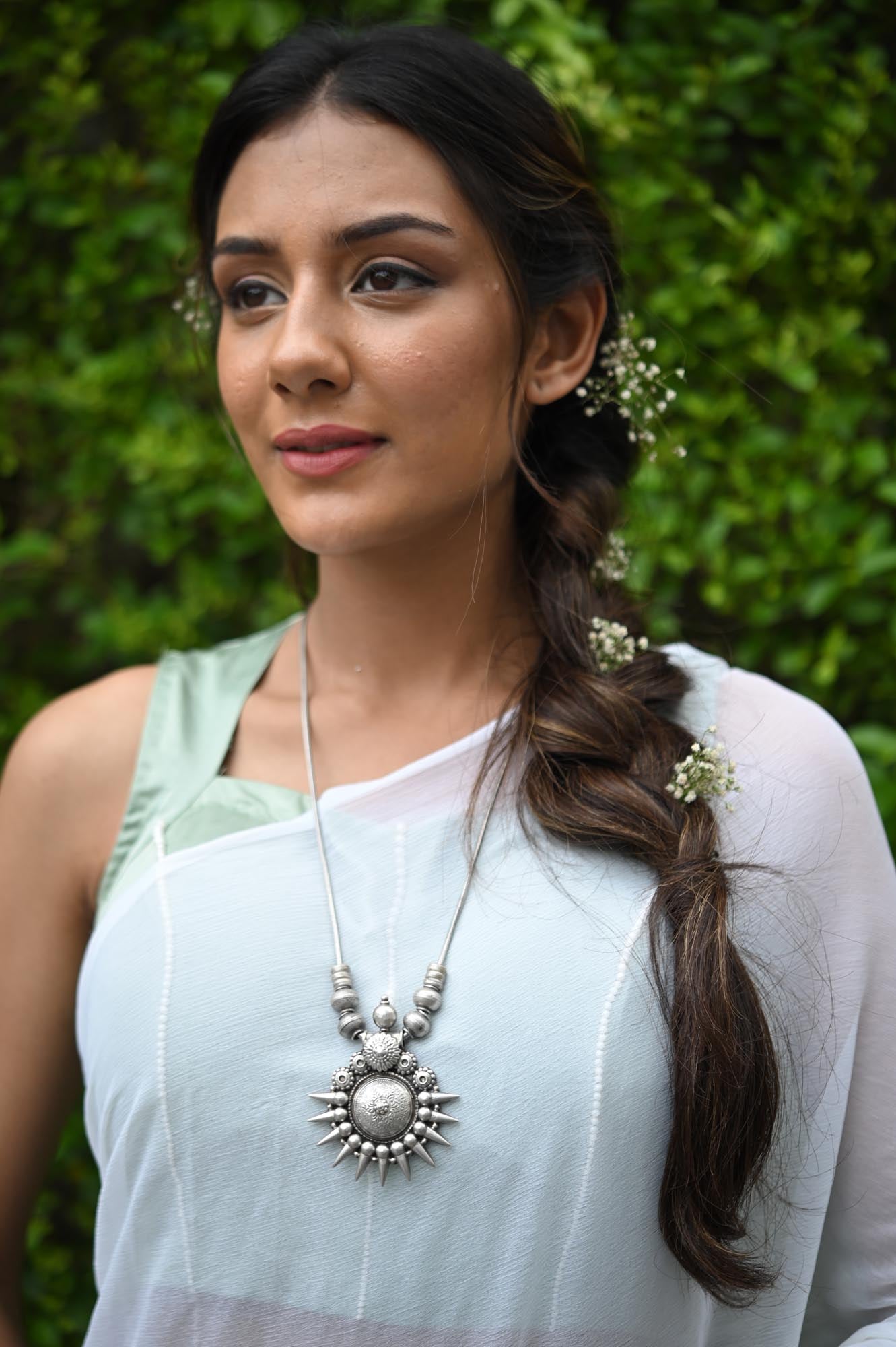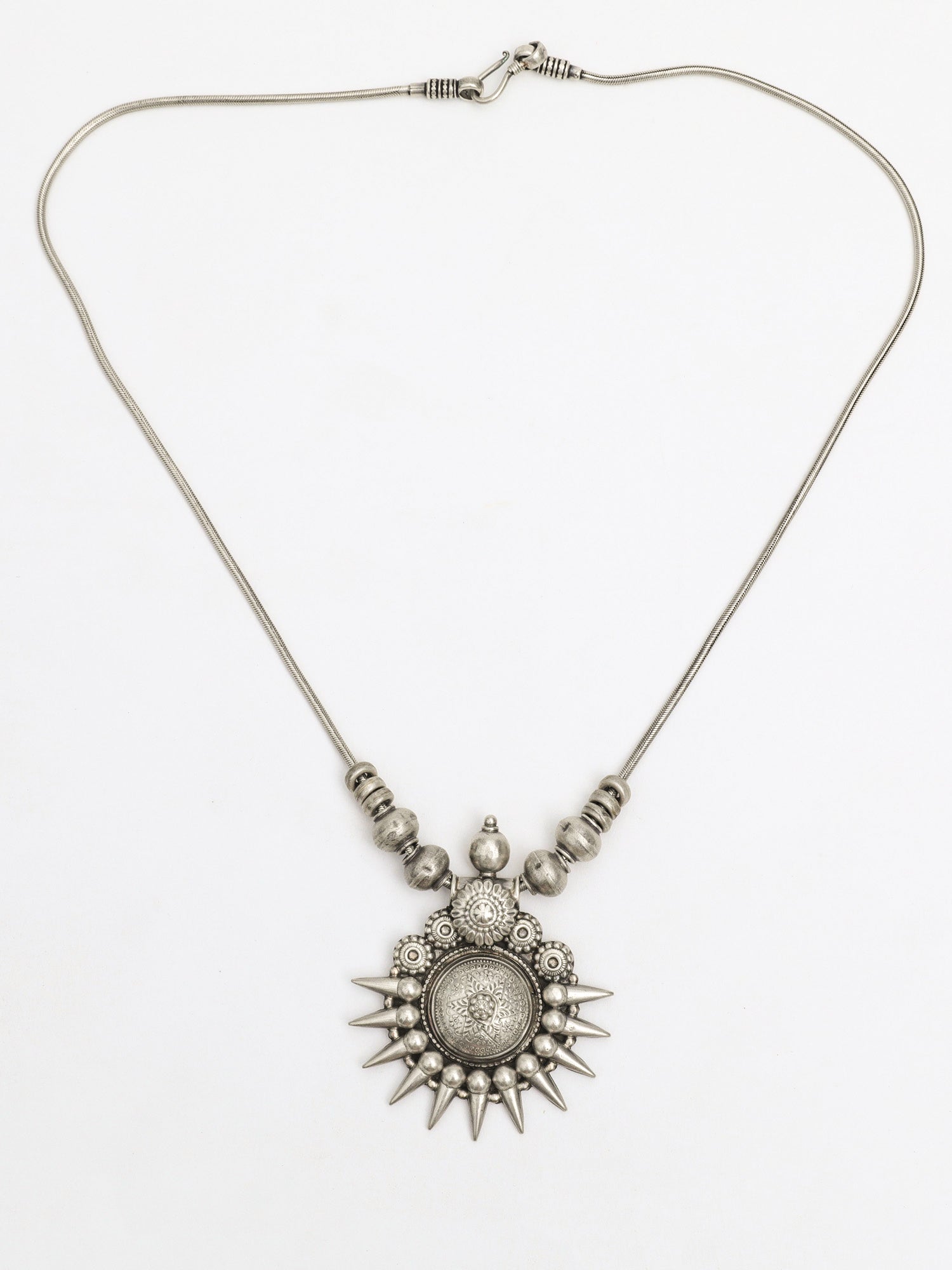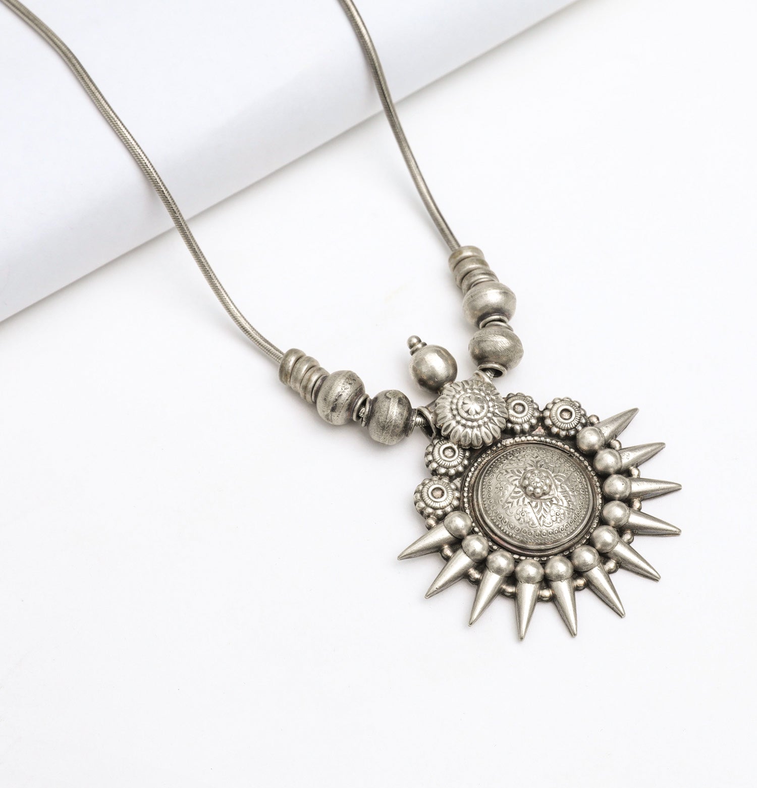 Surya textured silver long necklace with silver beads. Sun shaped pendant is with Flower motifs and texture. On the side, there are silver beads on a long snake chain. The chain can be opened by unscrewing the lock to remove the pendant.