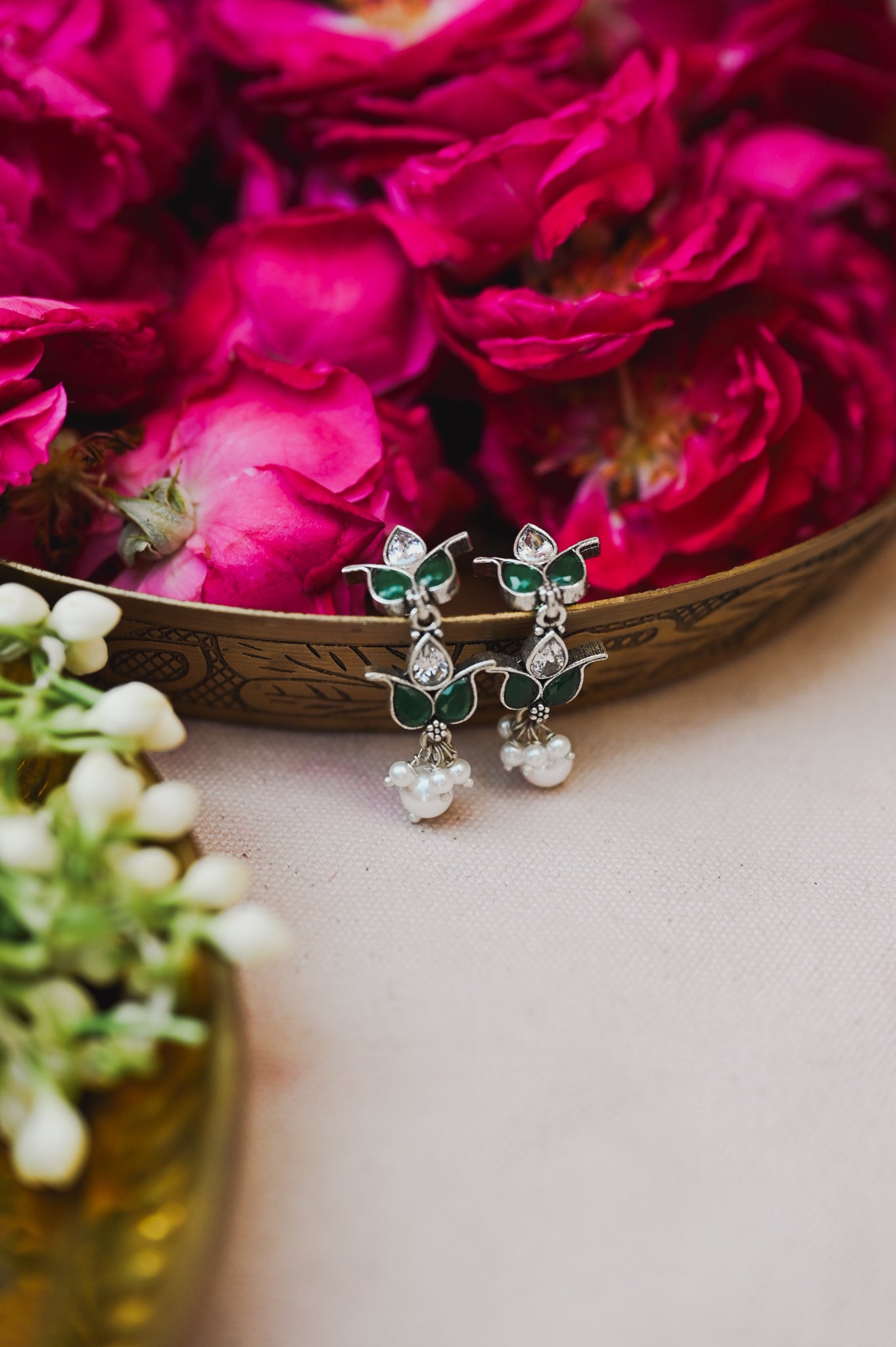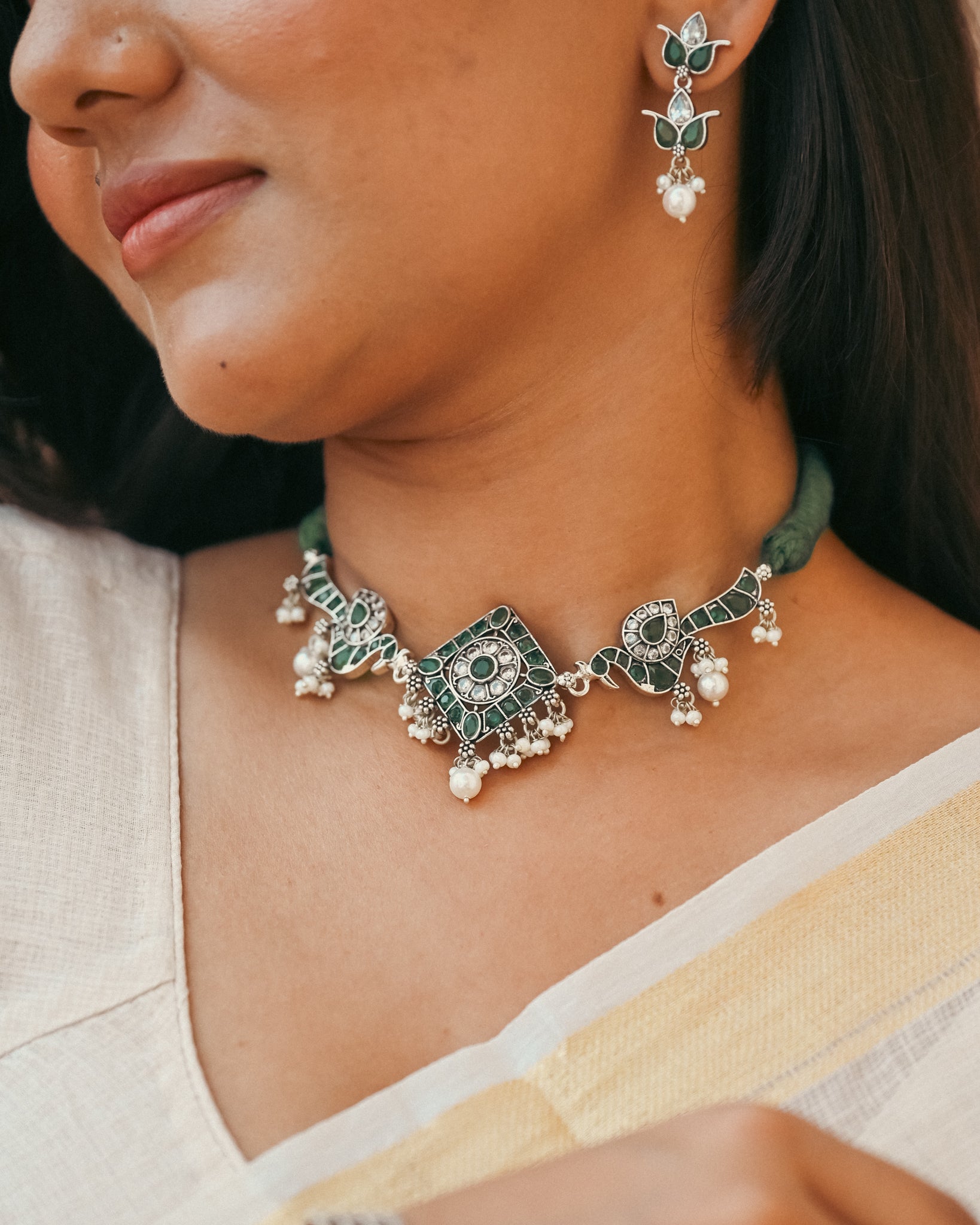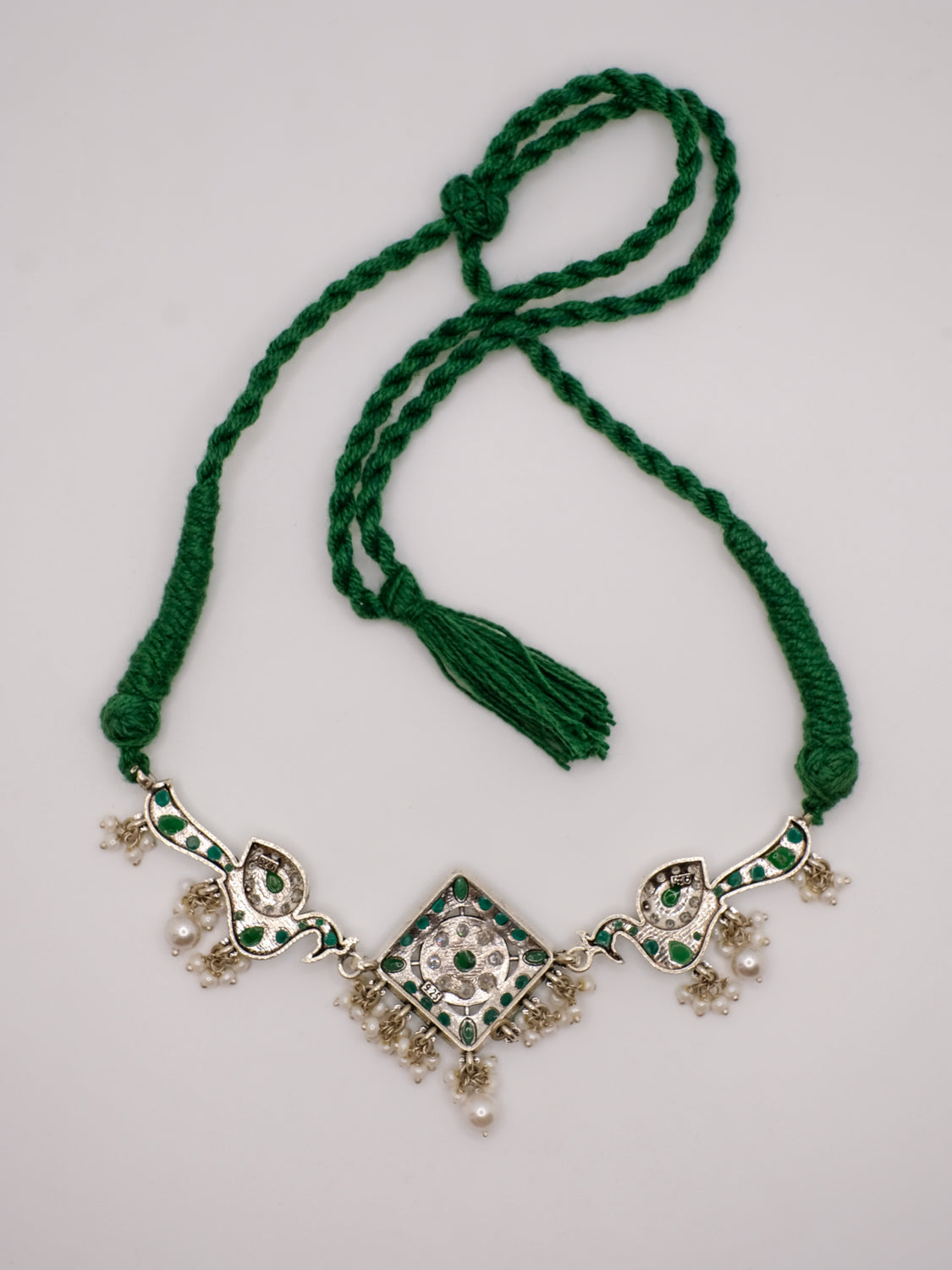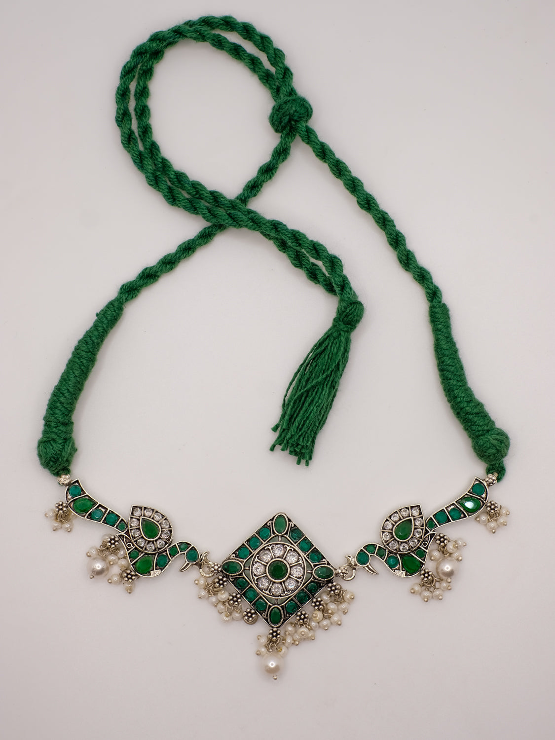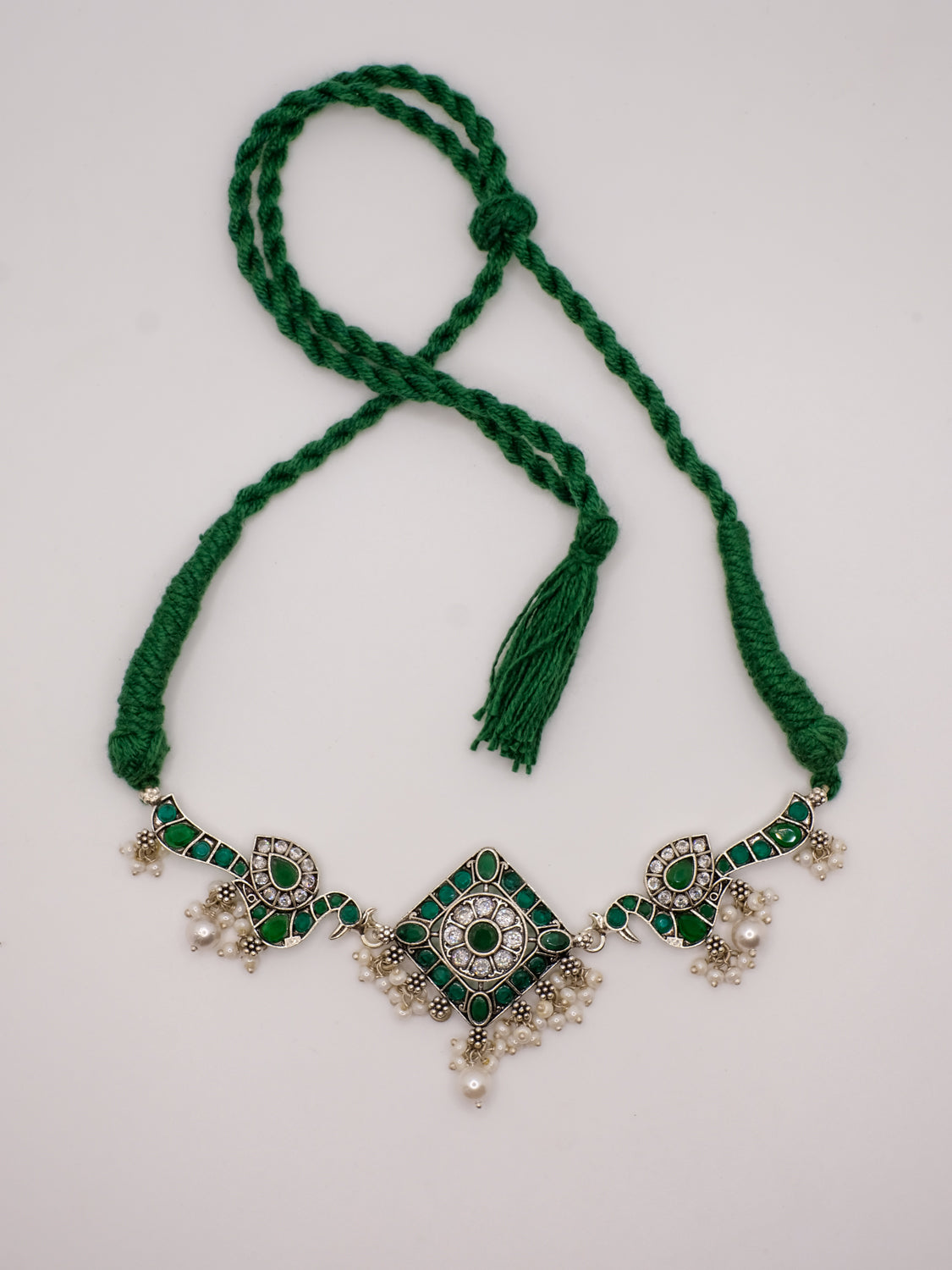 Beautiful handcrafted peacock studded with Emerald colour stone and white mossanite. With adjust thread..
