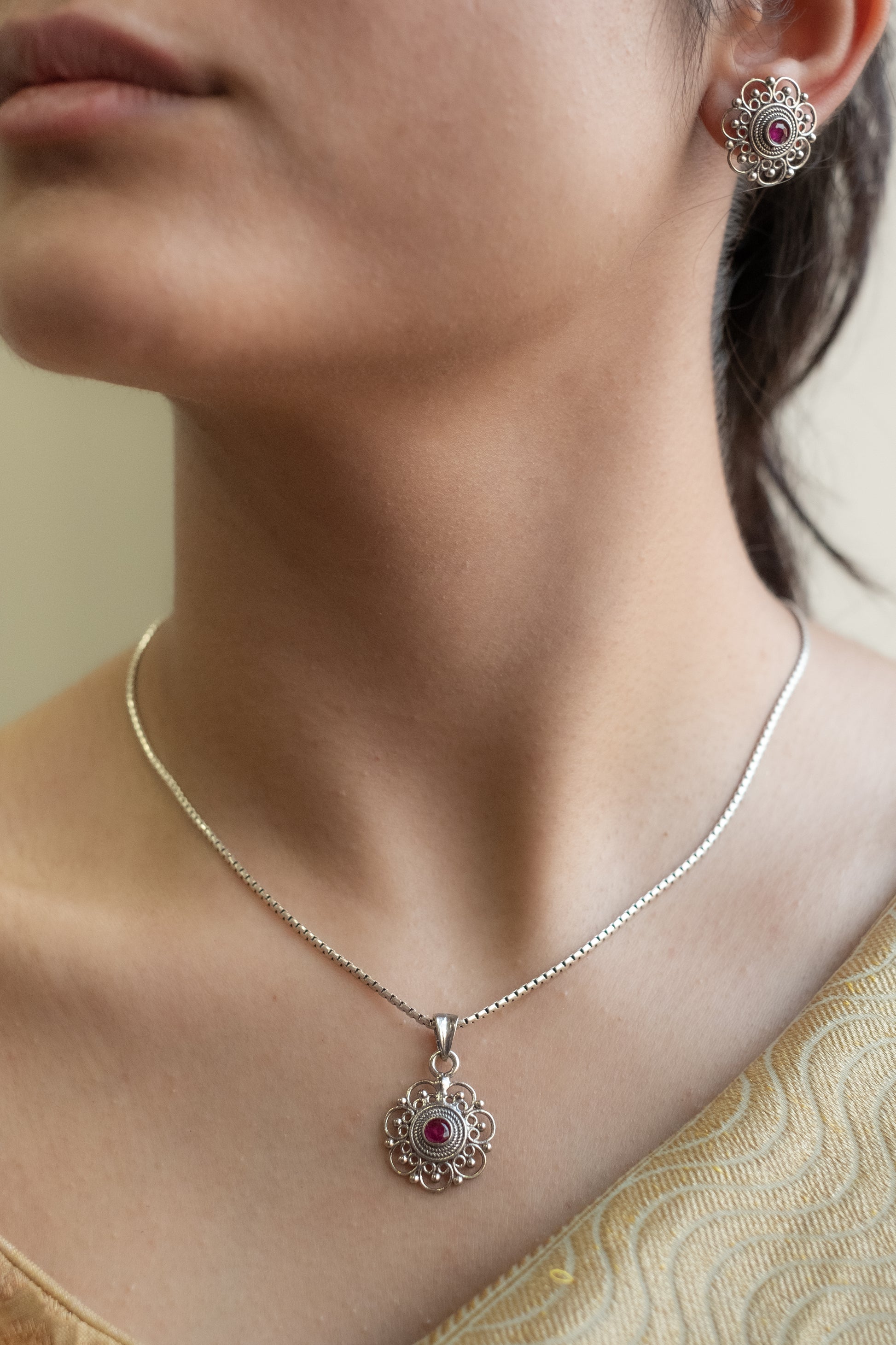 add a delicate touch to your outfit with these Floral Red Stone Jali Pendant. ( Only Pendant)