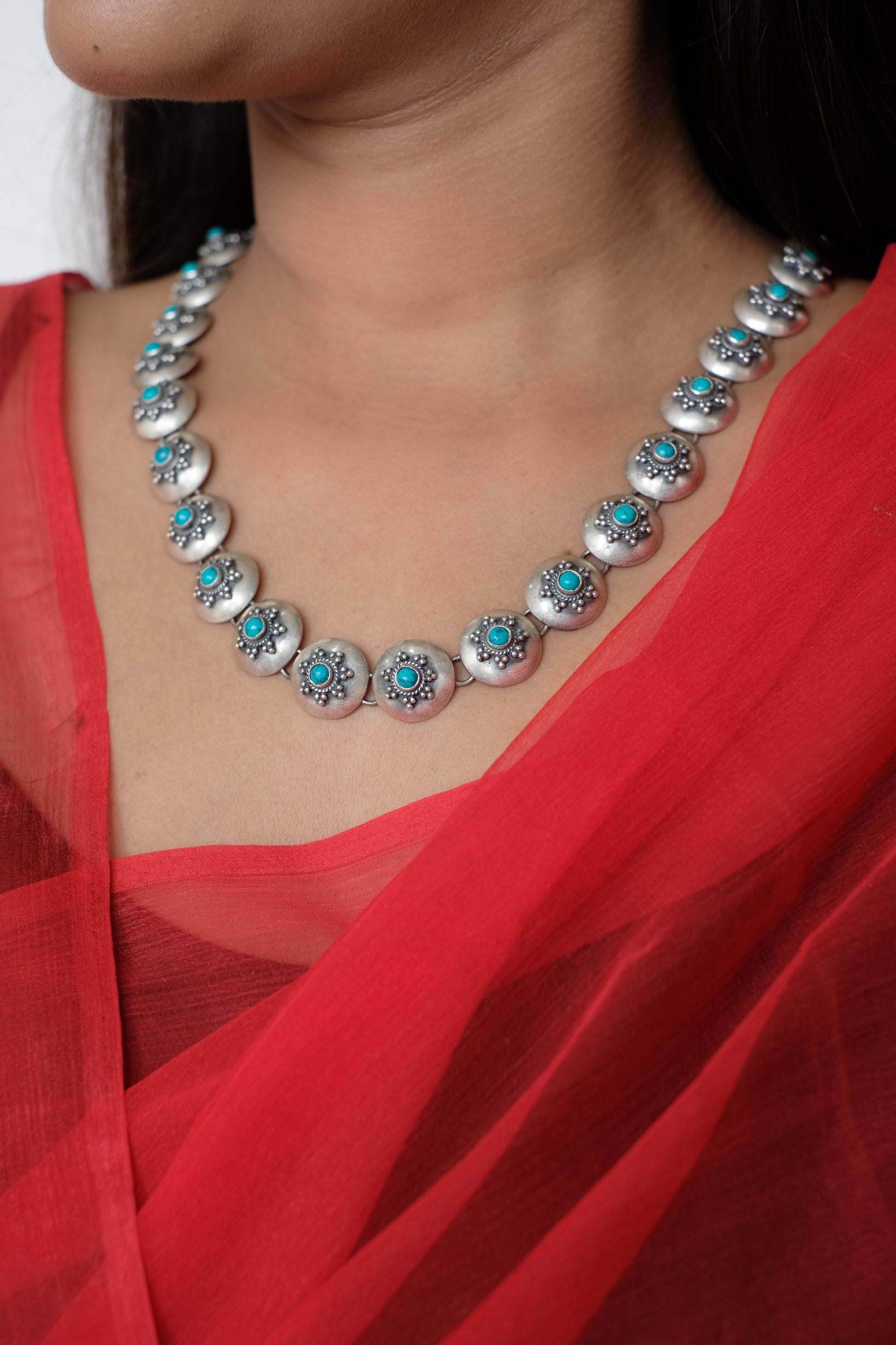 Complete your outift with a granulated turquoise long disk necklace.
