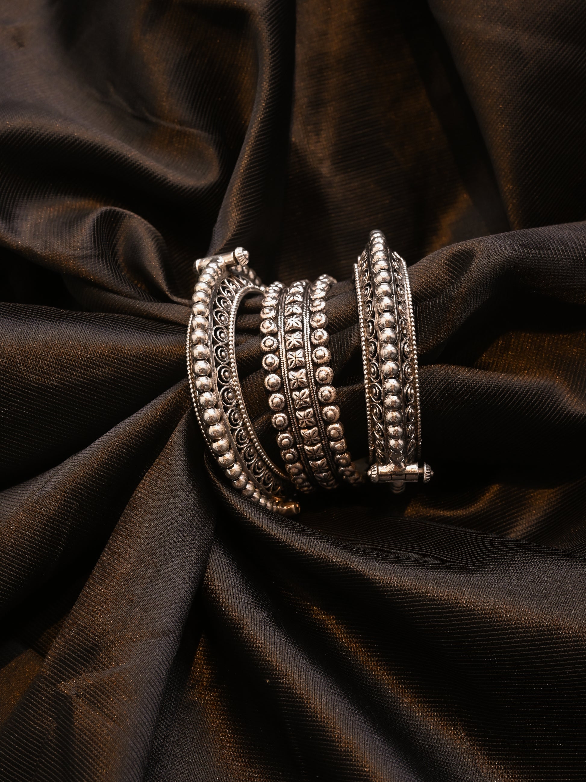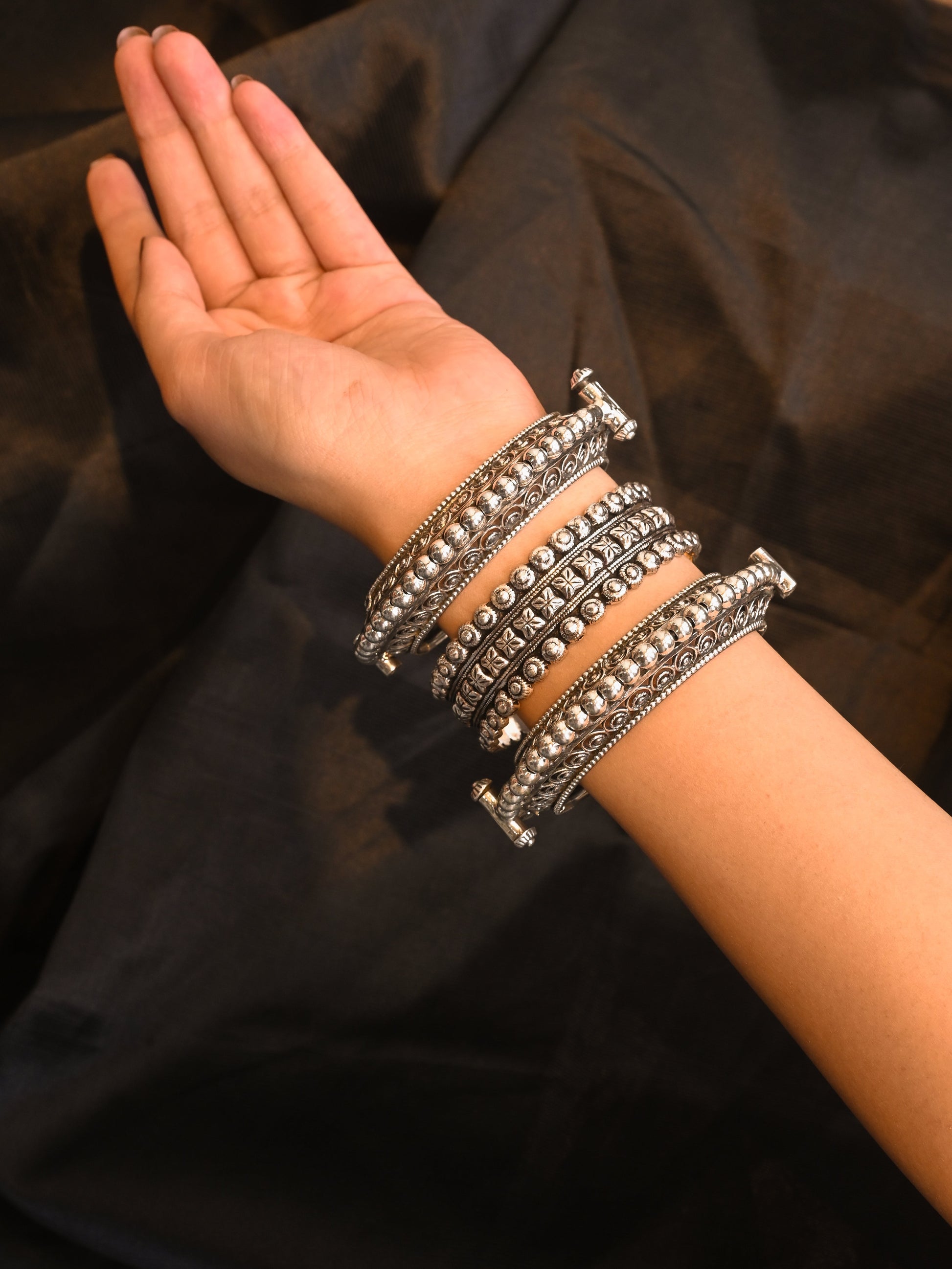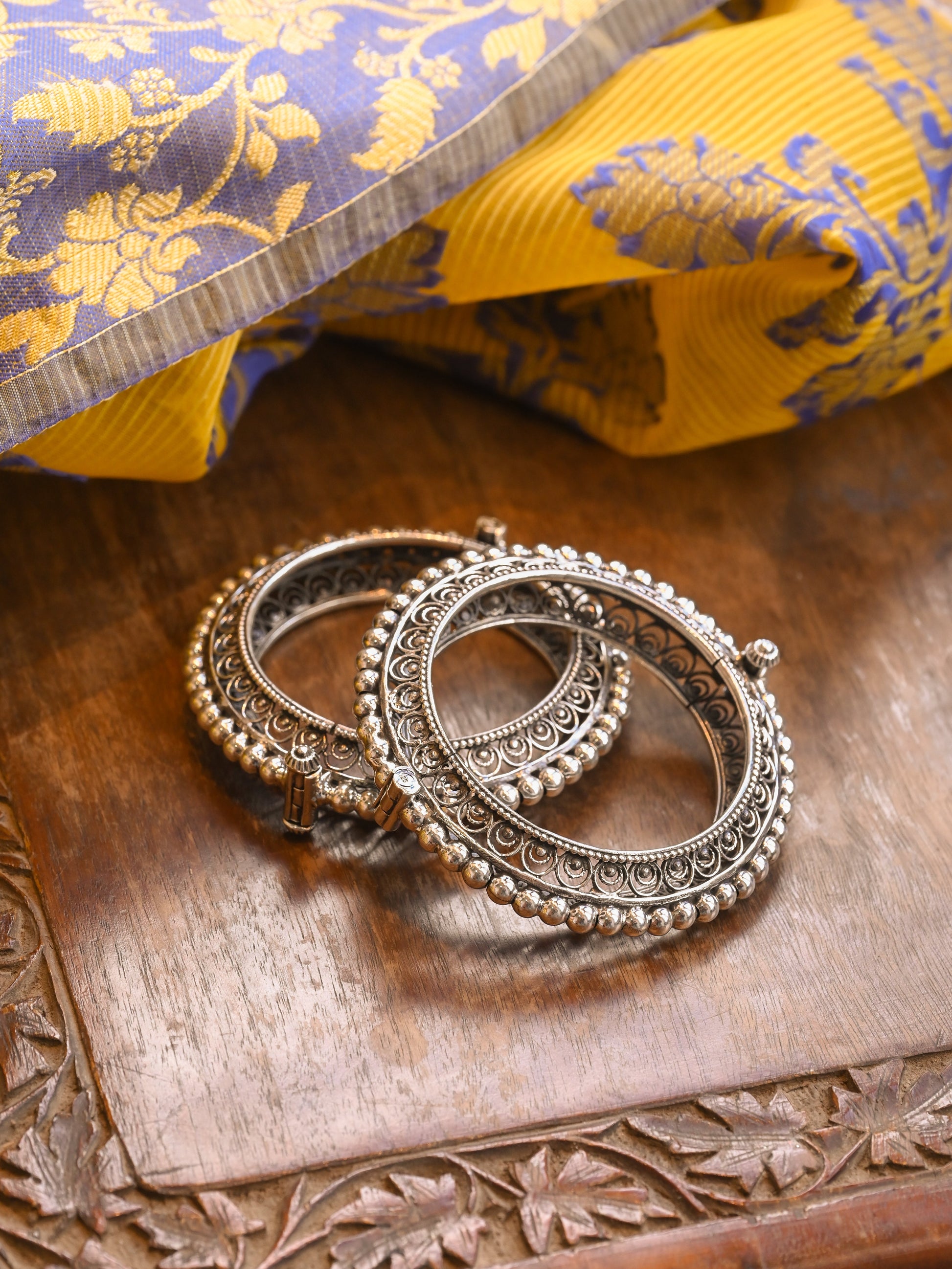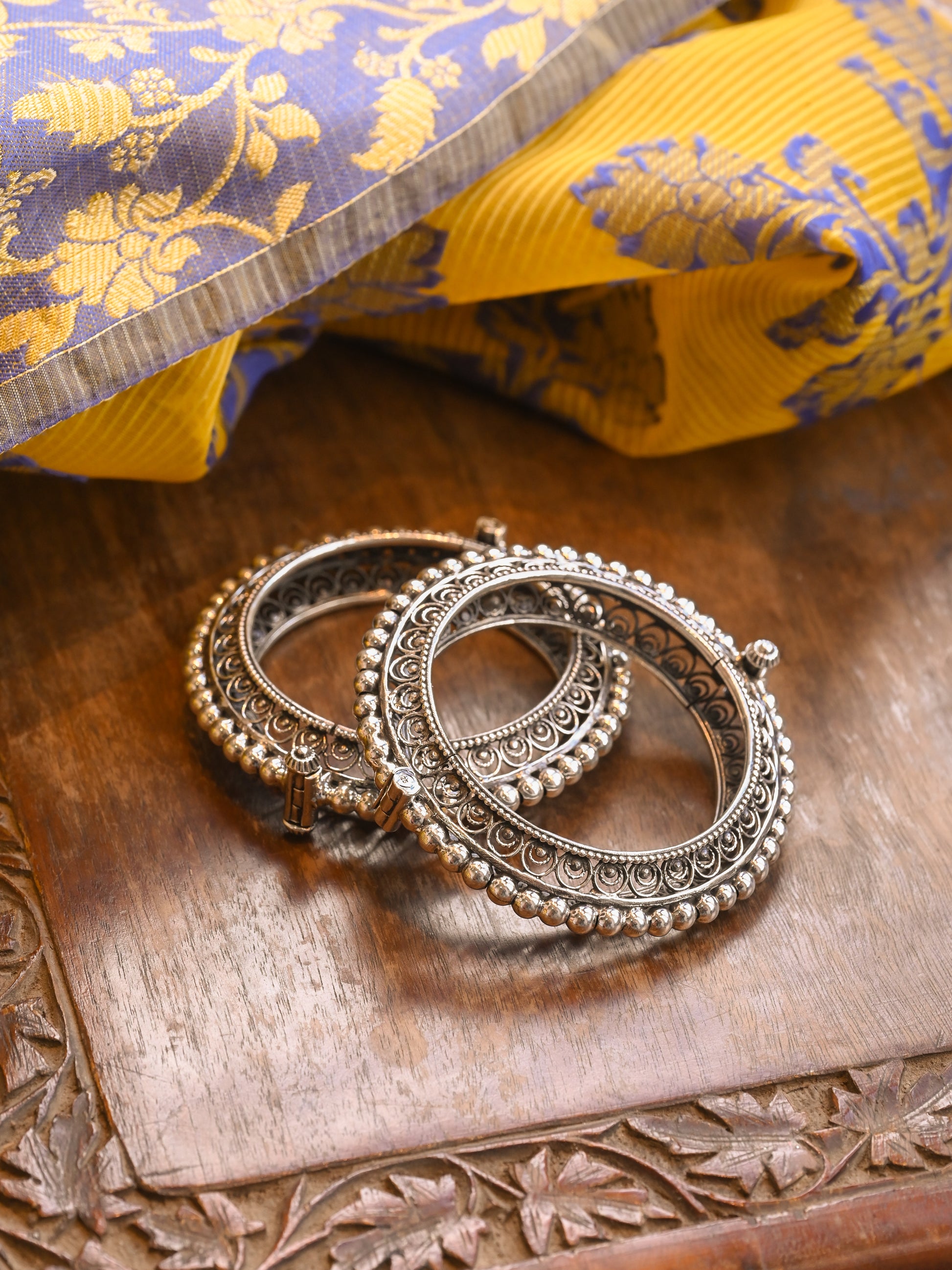 Openable silver bangle with jali work and ball granulated design to elevate your occasion look.