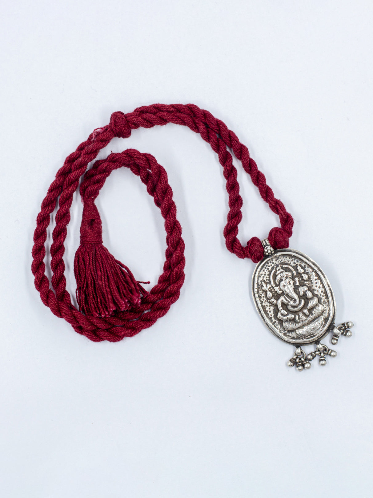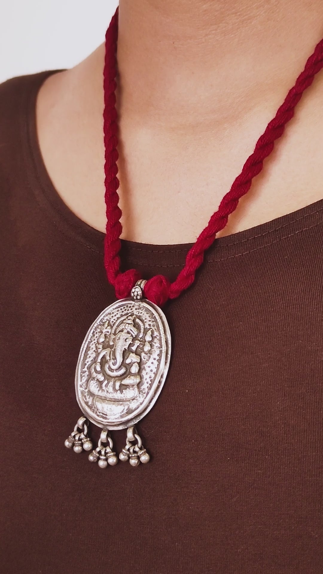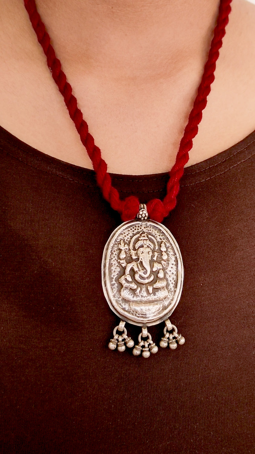 Seek blessings with god ganesh pendant embellished with ghungroo hangings thread necklace. Adjustable size.
