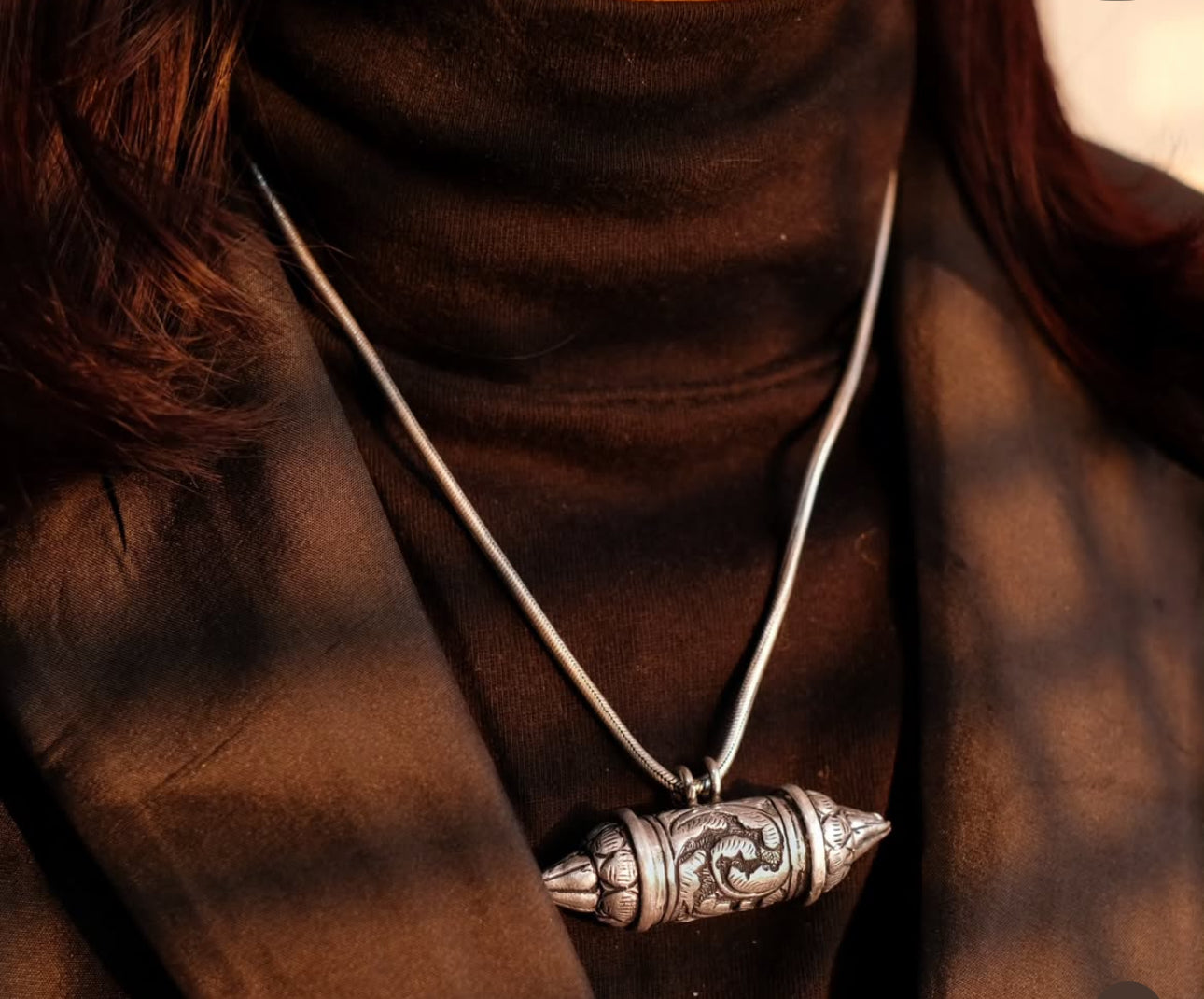 Exposed to the atmosphere, all silver is prone to oxidation and consequent tarnishing. Gentle rubbing with a silver cloth will restore the original brilliance. Do not use liquid cleaners for carved silver jewellery as it dries into the engraving.
