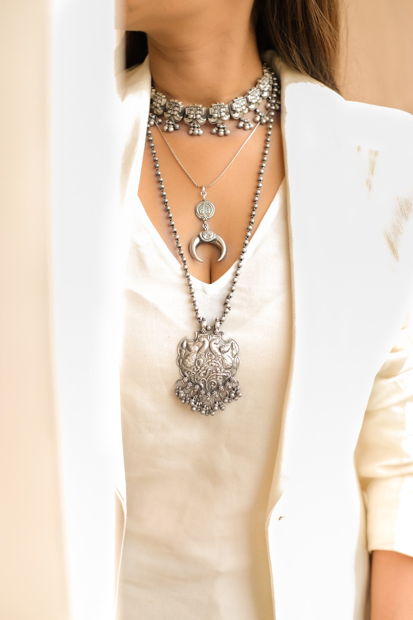 Peacock embossed pendant embellished with ghongroo earrings with ball chain. Chain size can be customized.