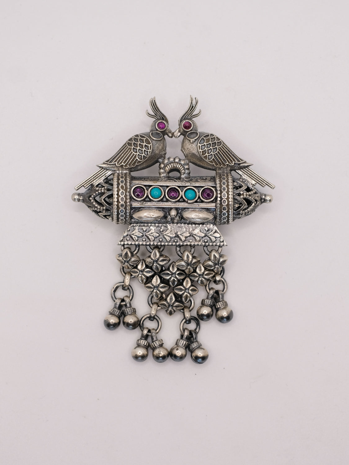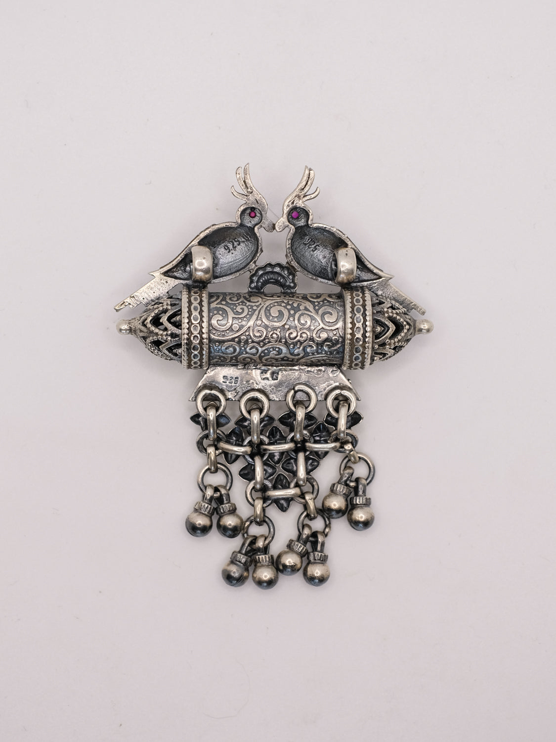 Exposed to the atmosphere, all silver is prone to oxidation and consequent tarnishing. Gentle rubbing with a silver cloth will restore the original brilliance. Do not use liquid cleaners for carved silver jewelry as it dries into the engraving.