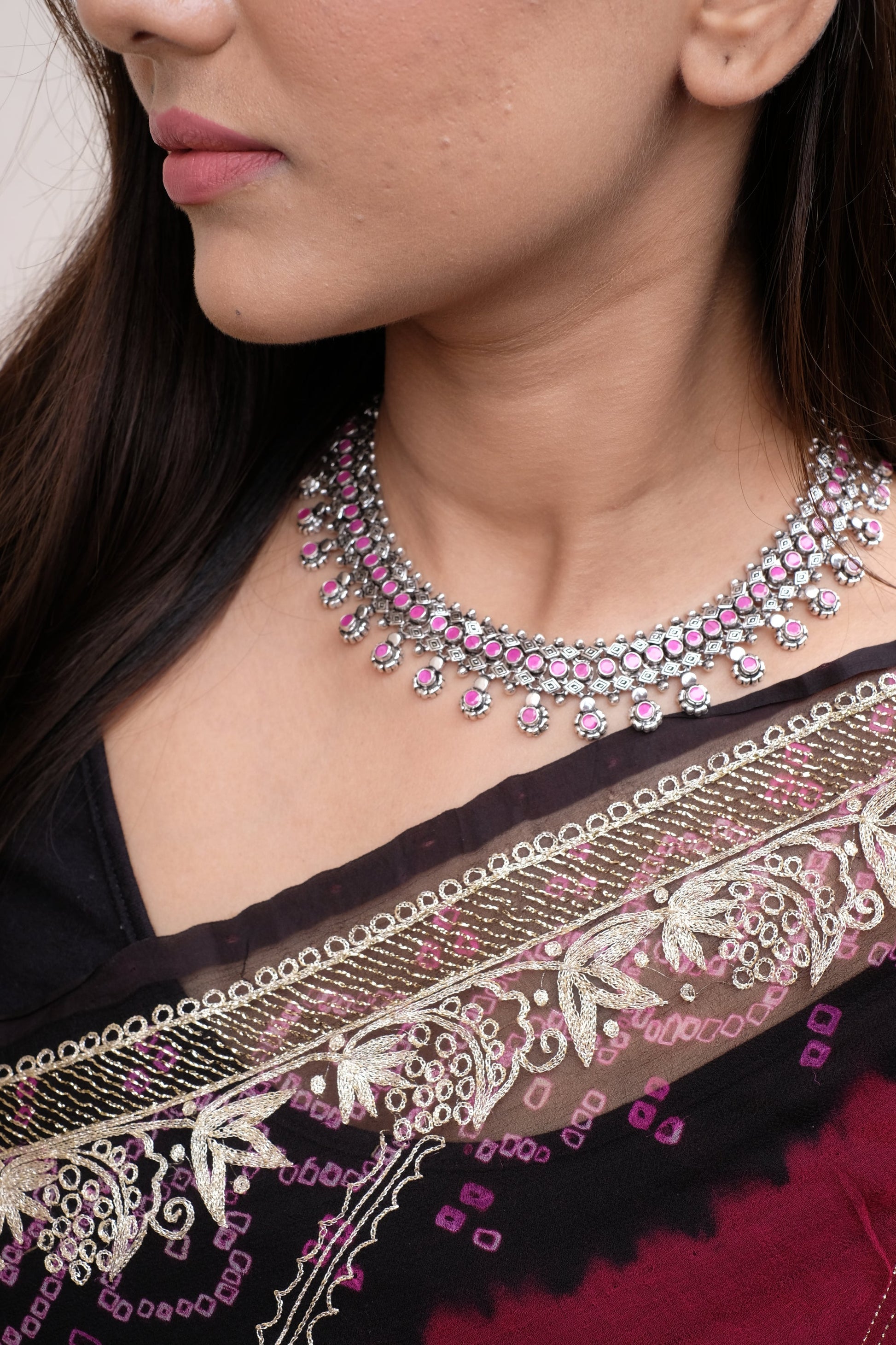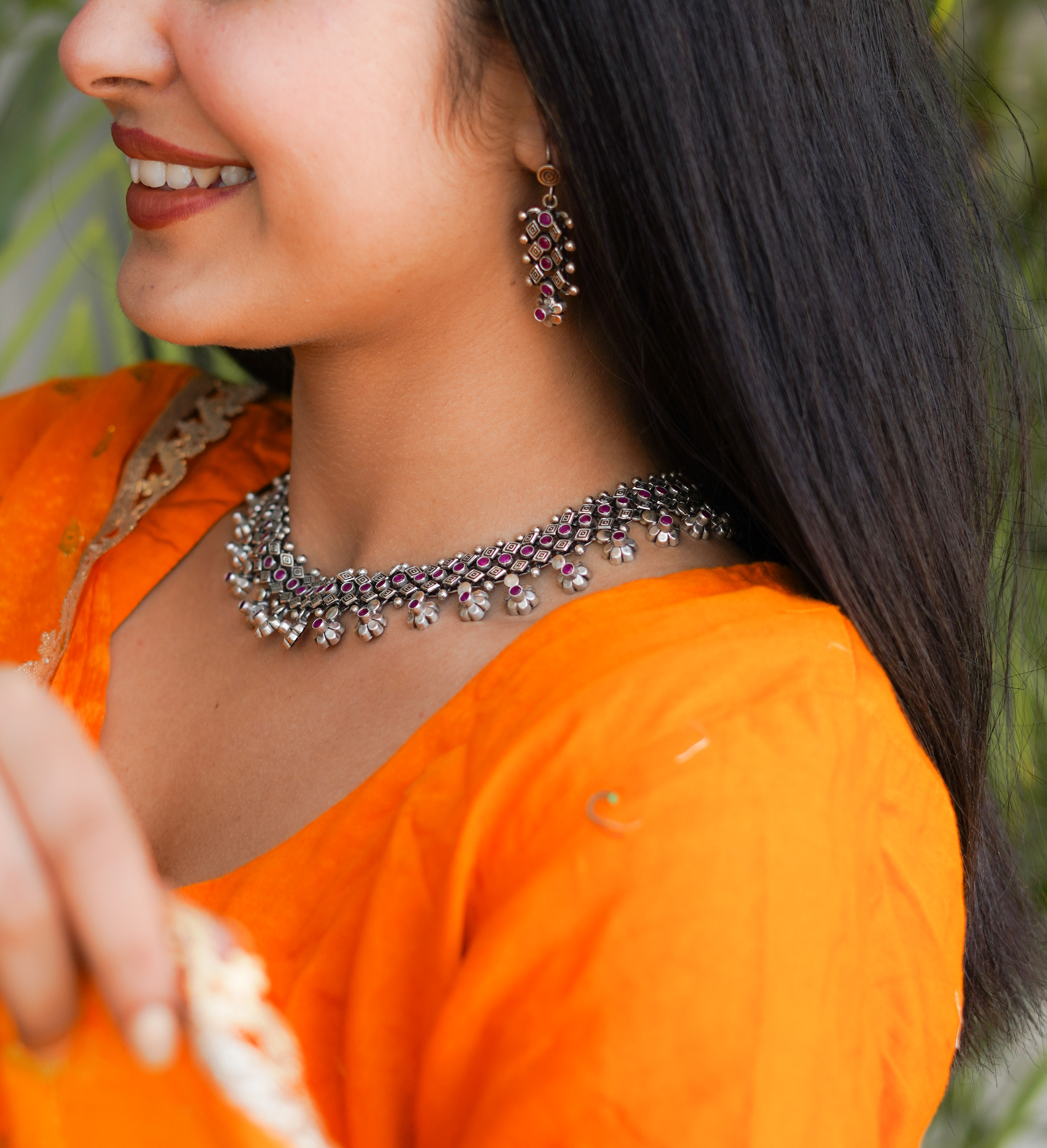 Silver necklace integrated three lines studded with red stones and flower hangings. Length can be adjusted with extra loops.