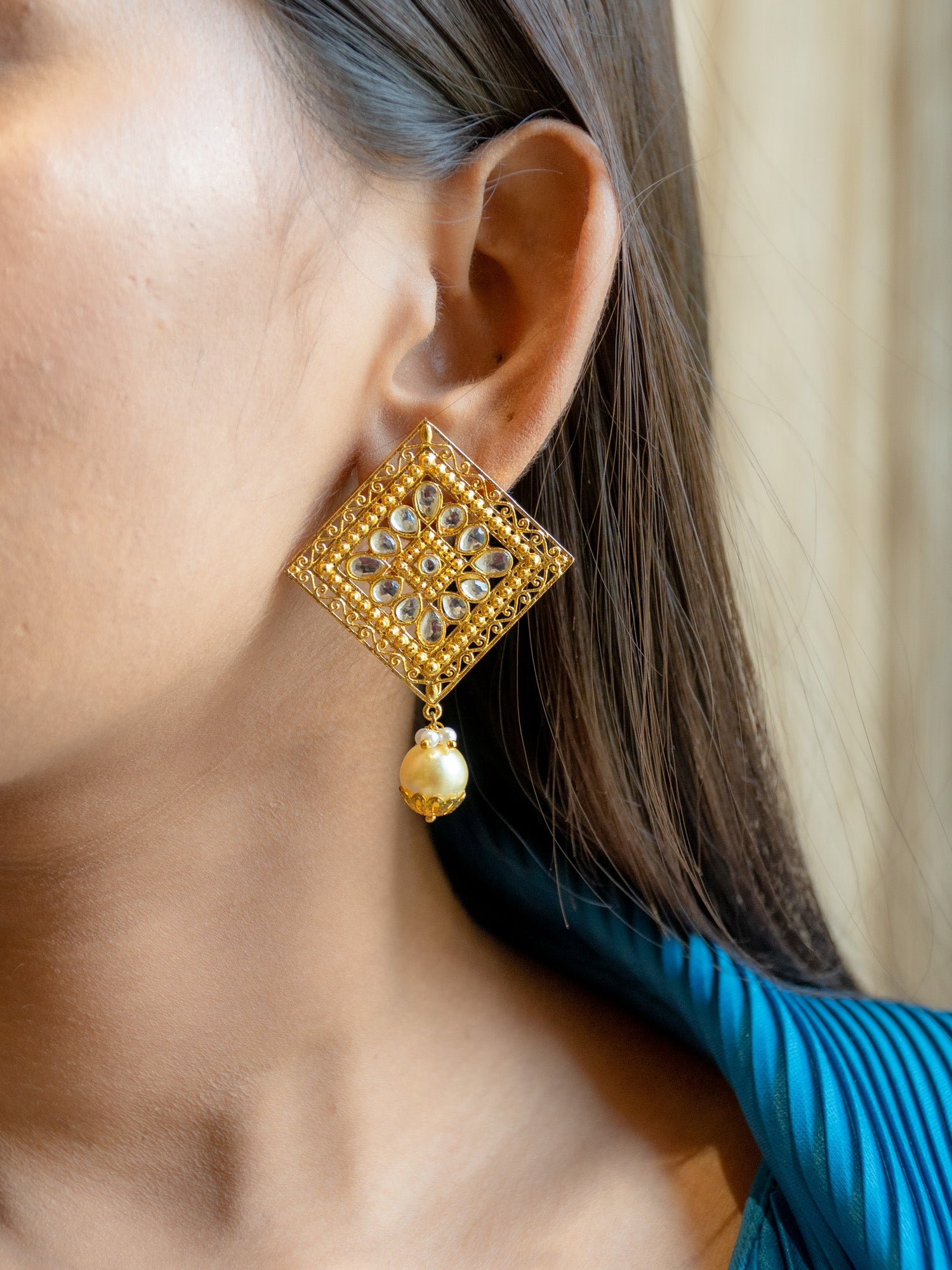 Square shape Metal Base Zircon Studded Pearl hanging Earrings perfect for every outfit.