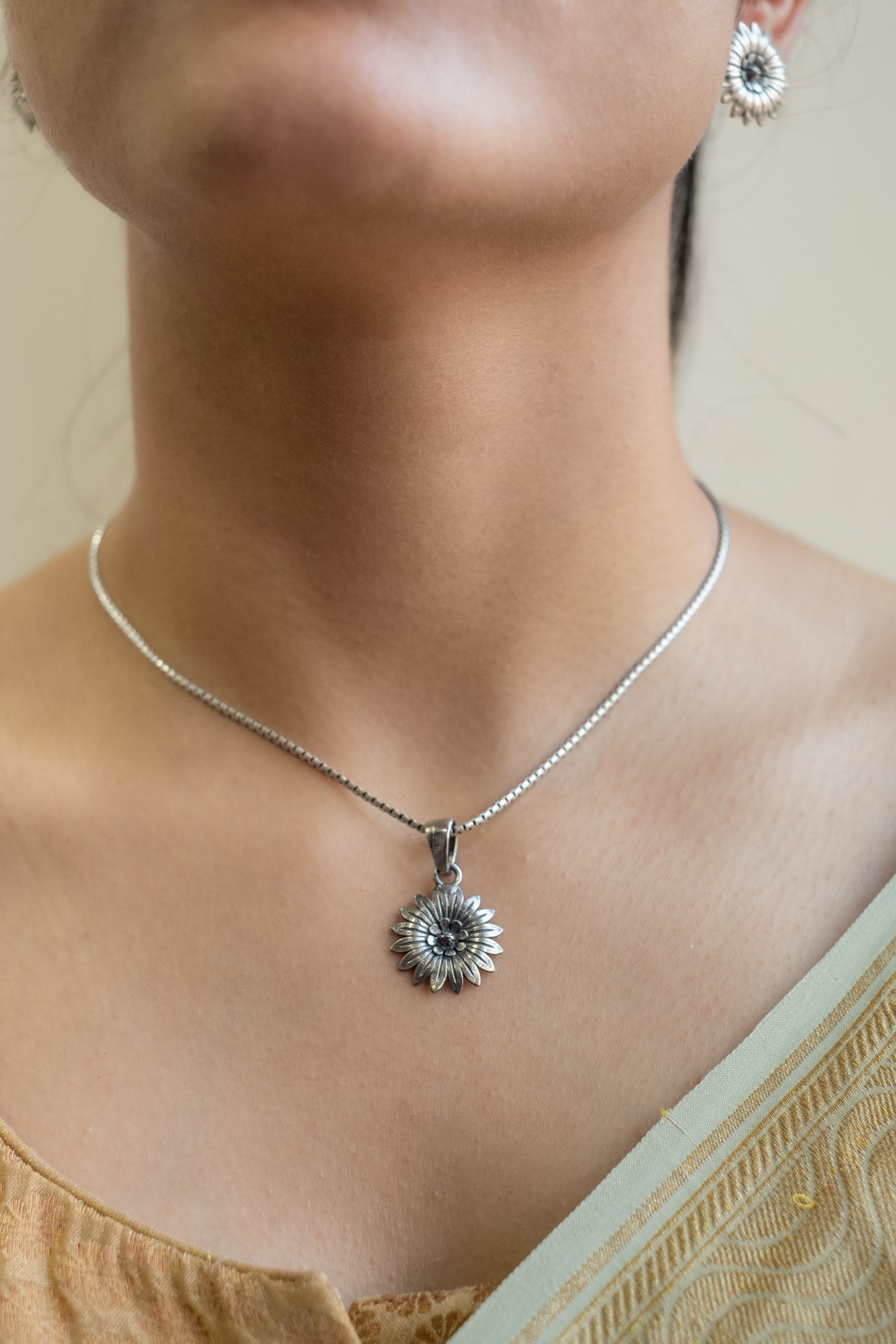 Add a delicate touch to your outfit with these sunflower marigold pendant
