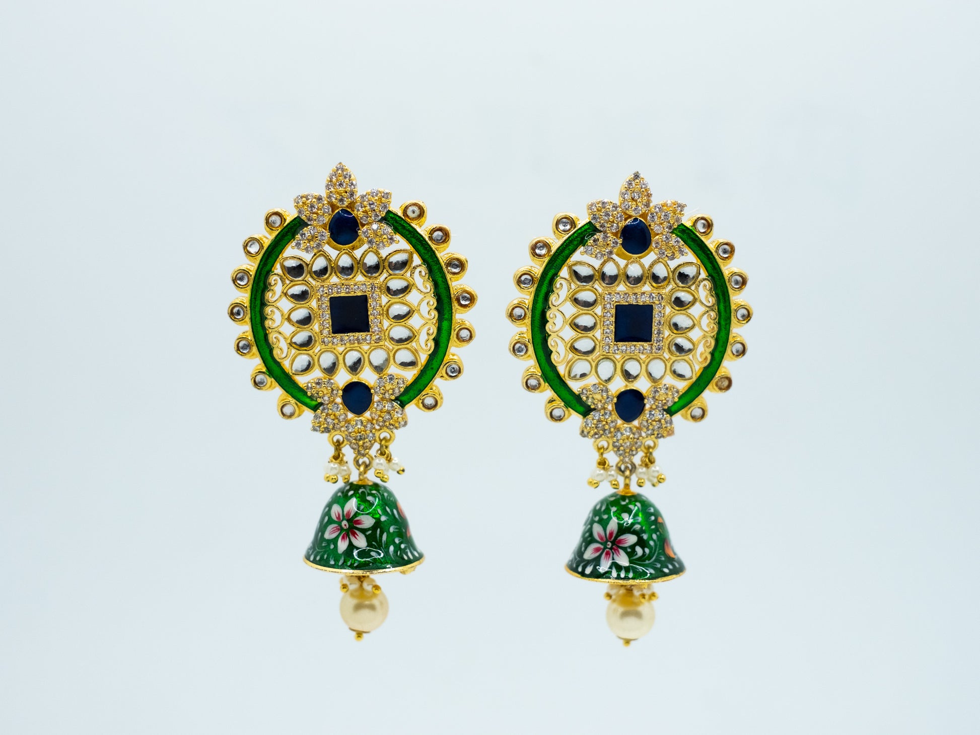 Metal Base Zircon Studded Pearl Enamel Jhumki Earrings are perfect for festIve or occasion wear.