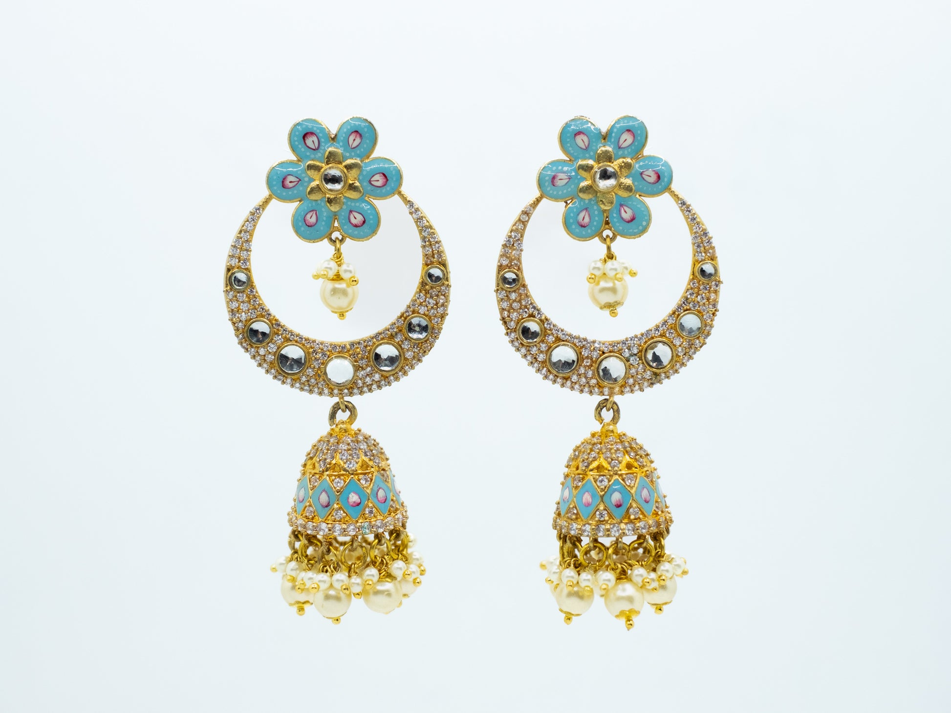 Zircon Studded Pearl Turquise Enamel Chandbali Jhumki Earrings.